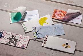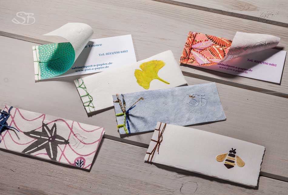 Visitenkarten aus verschiedenen Papieren mit Fadenbindung