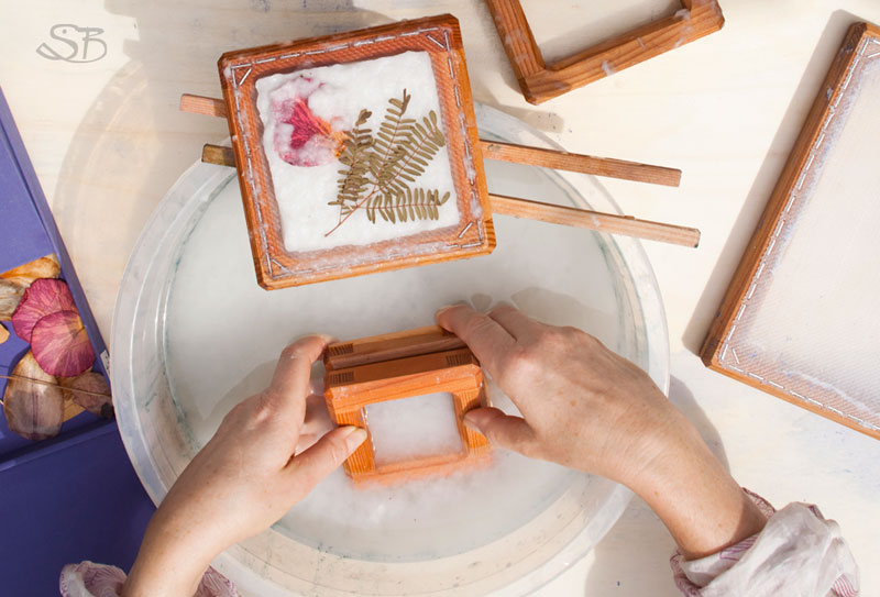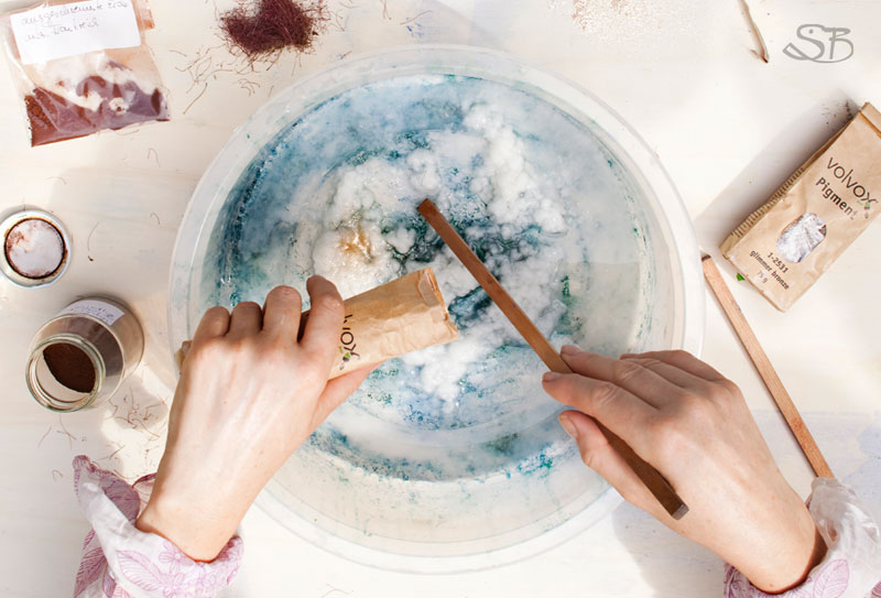 Das Einrühren von Farbpigmenten und getrockneten Pflanzenteilen in die Papier-Pulpe