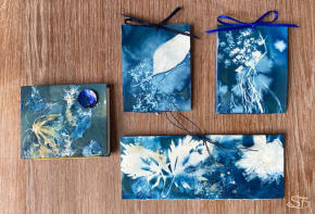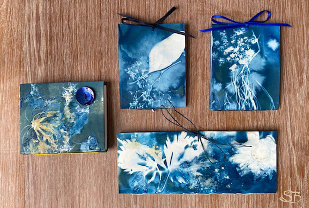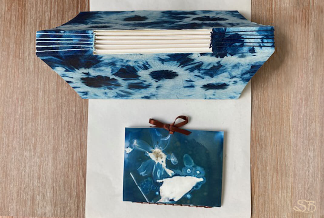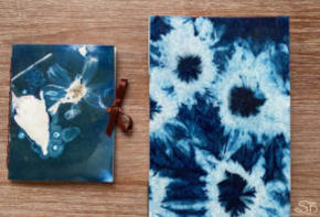 Cyanoflora-Bücher: mit Hilfe starker Sonneneinstrahlung werden gesammelte Blüten, Blätter und Pflanzenteile auf das Papier projeziert. Cyanotopie ist eine Form der ältesten Fotoentwicklung.