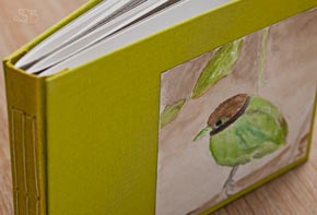 Buchobjekt Fotoalbum, japanische Bindung mit Vogel-Aquarell auf dem Buchdeckel